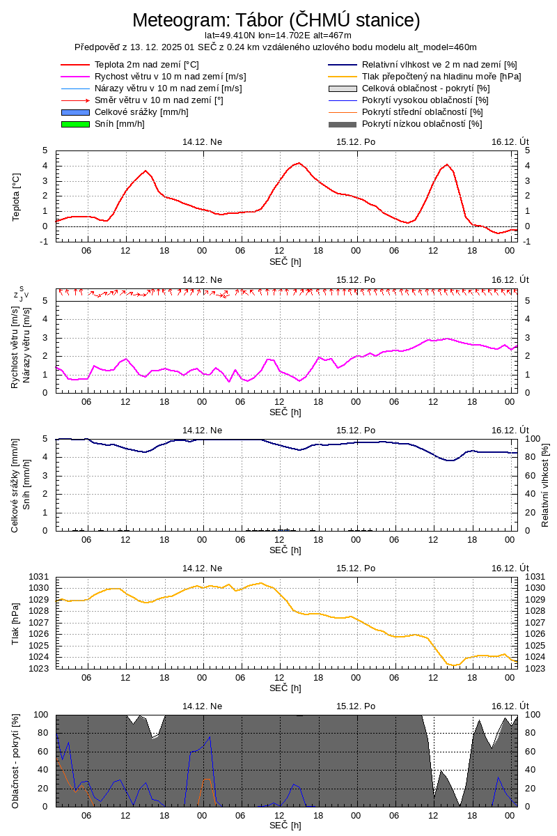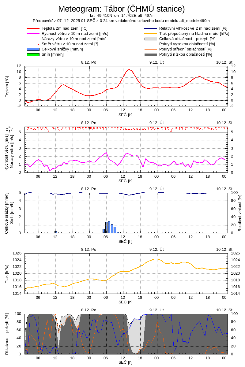 | Legenda: | Oblačnost (%) | Srážky dešťové(mm/m2 za hod.) | Vítr (m/s) |
