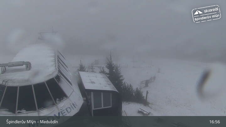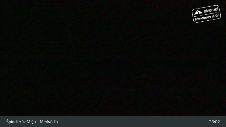 Pohled z webové kamery směr (zprava) sjezdovka Špindlerův Mlýn - Pláň, uprostřed sjezdovka Svatý Petr - Stoh, dále vlevo Luční hora a v pozadí vykukuje vrchol Sněžky. Při troše snahy je možné najít vpravo od Sněžky i Luční boudu.