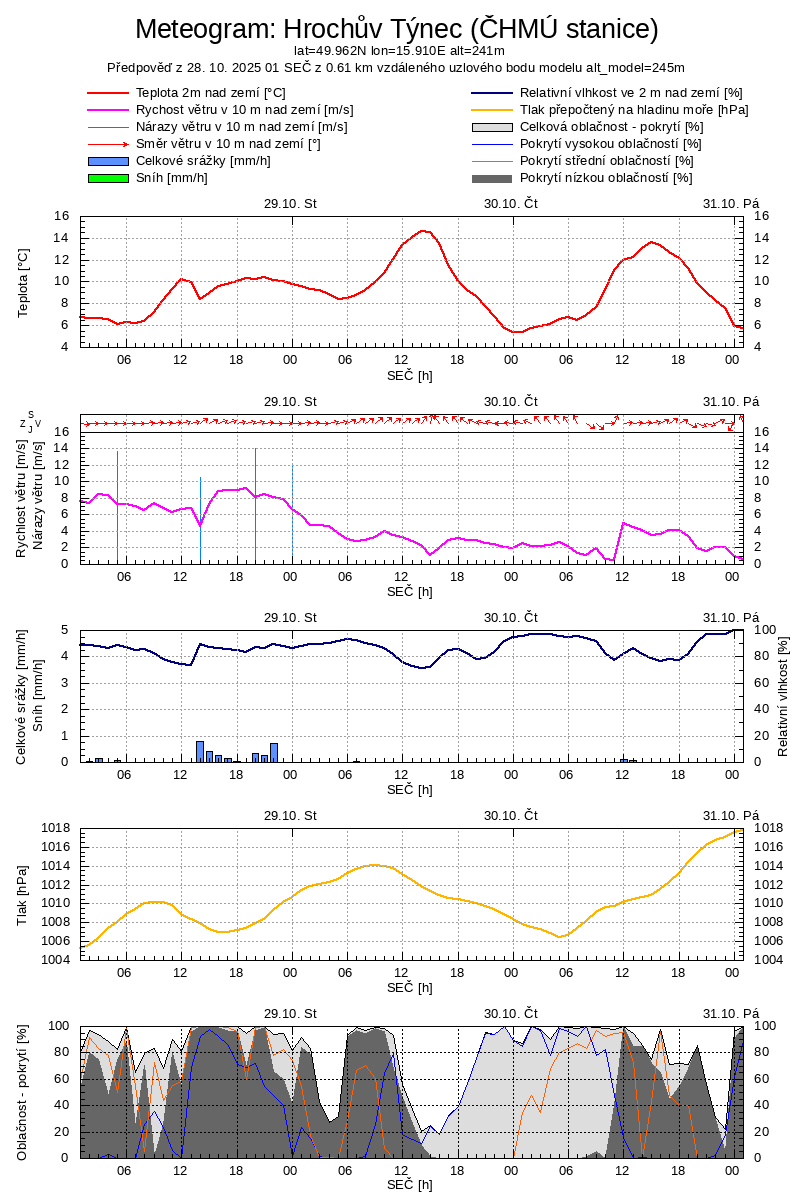 | Legenda: | Oblačnost (%) | Srážky dešťové(mm/m2 za hod.) | Vítr (m/s) |