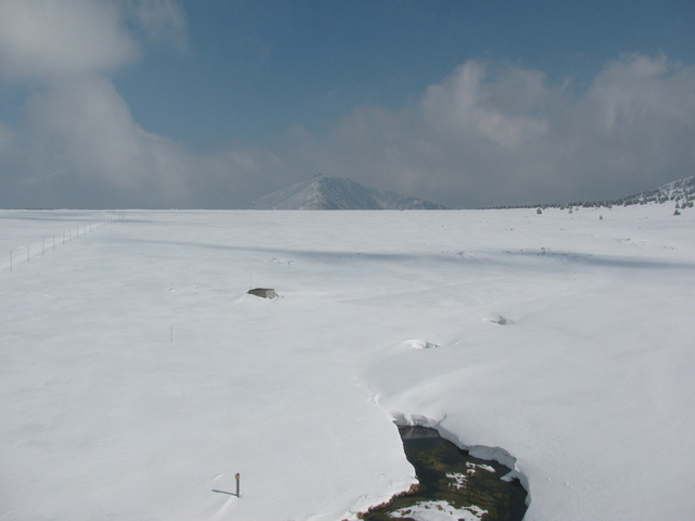 Pohled z webové kamery na Luční boudě východním směrem na Sněžku přes pramen Bílého Labe a Úpské rašeliniště.