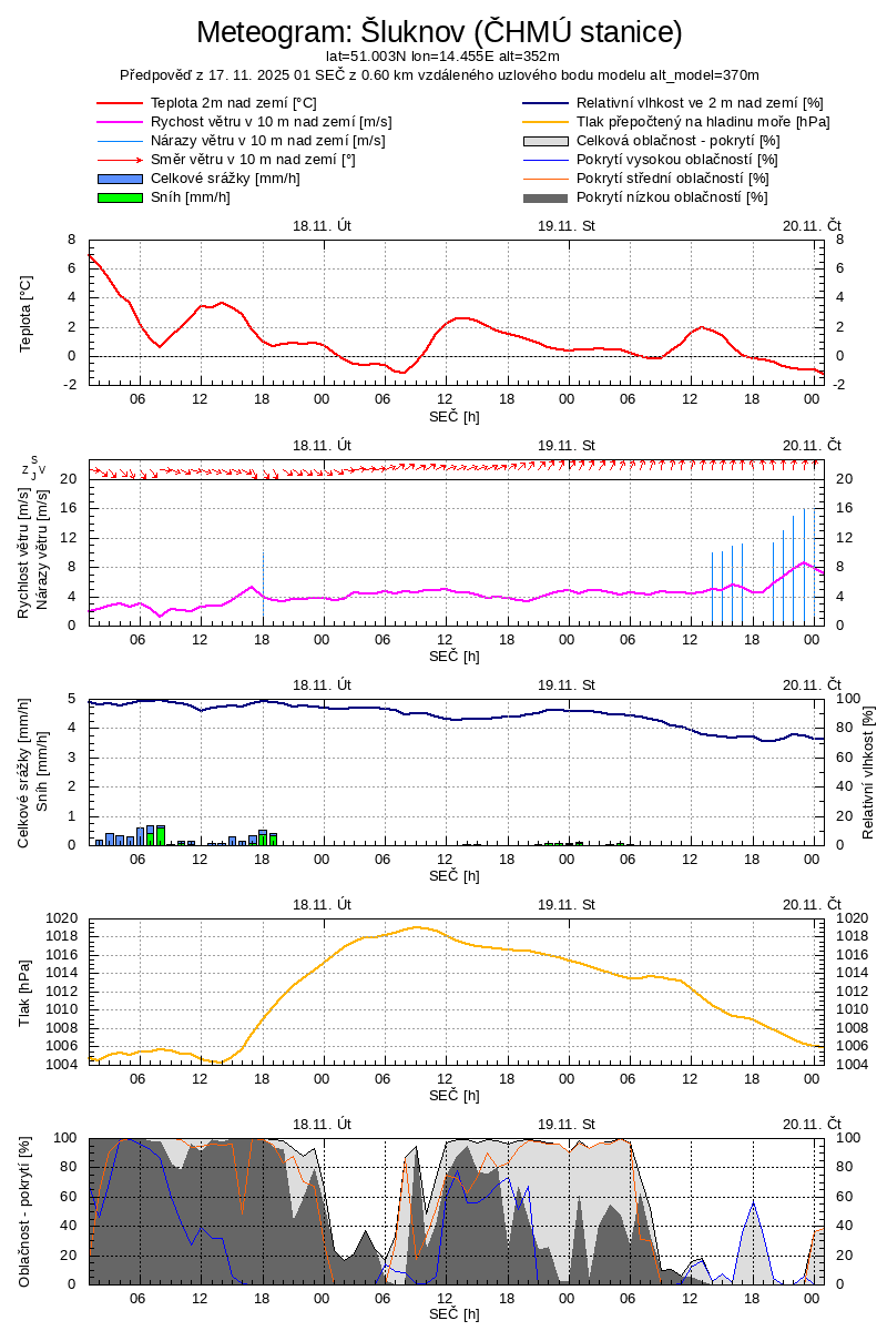 | Legenda: | Oblačnost (%) | Srážky dešťové(mm/m2 za hod.) | Vítr (m/s) |
