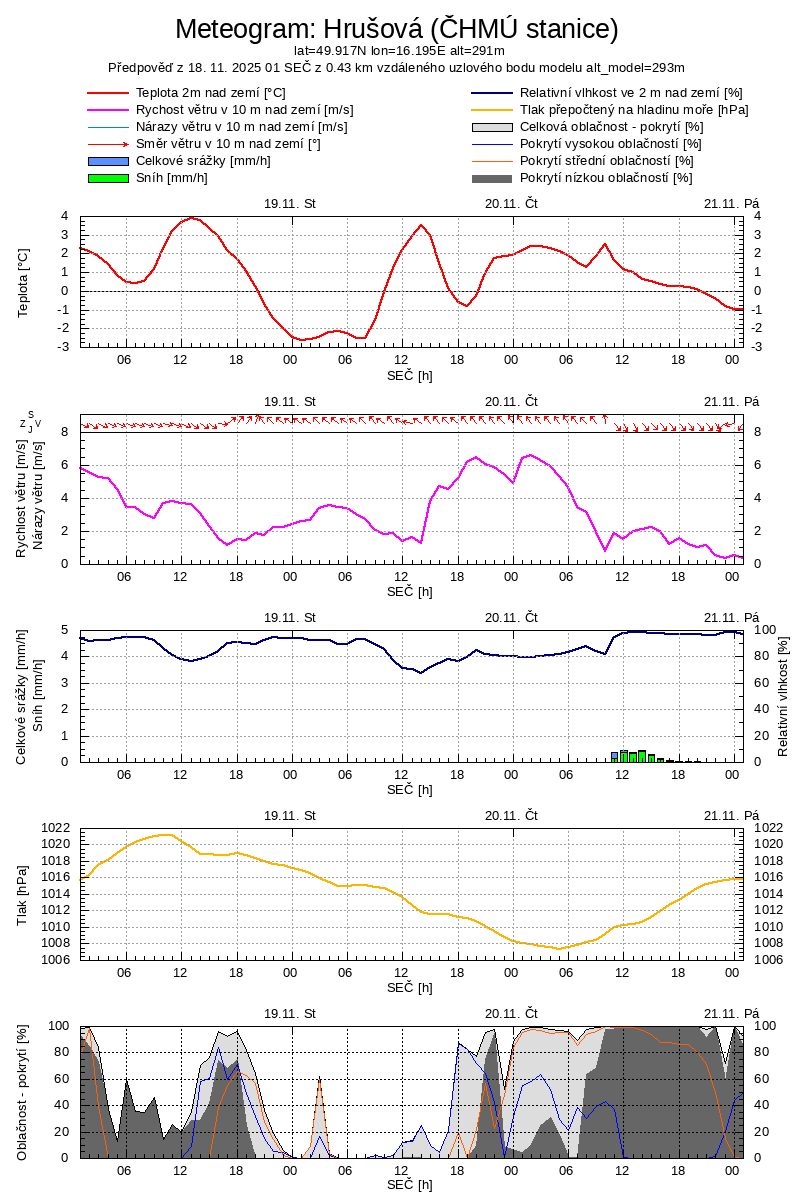 | Legenda: | Oblačnost (%) | Srážky dešťové(mm/m2 za hod.) | Vítr (m/s) |