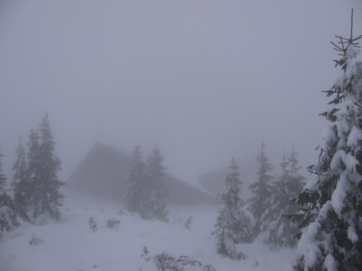 Pohled z webové kamery na Labské boudě. Zprava lze vidět vrchol Zlatého návrší, dále Medvědín a vlevo dobře patrná sjezdovka na Špindlerův Mlýn - Stoh.
