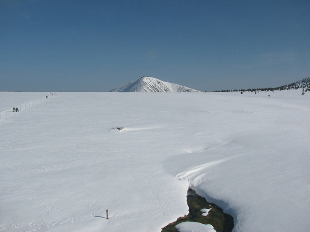 Pohled z webové kamery na Luční boudě východním směrem na Sněžku přes pramen Bílého Labe a Úpské rašeliniště.