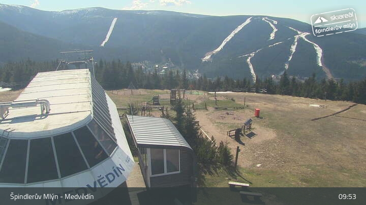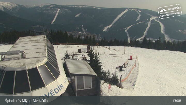 Pohled z webové kamery směr (zprava) sjezdovka Špindlerův Mlýn - Pláň, uprostřed sjezdovka Svatý Petr - Stoh, dále vlevo Luční hora a v pozadí vykukuje vrchol Sněžky. Při troše snahy je možné najít vpravo od Sněžky i Luční boudu.