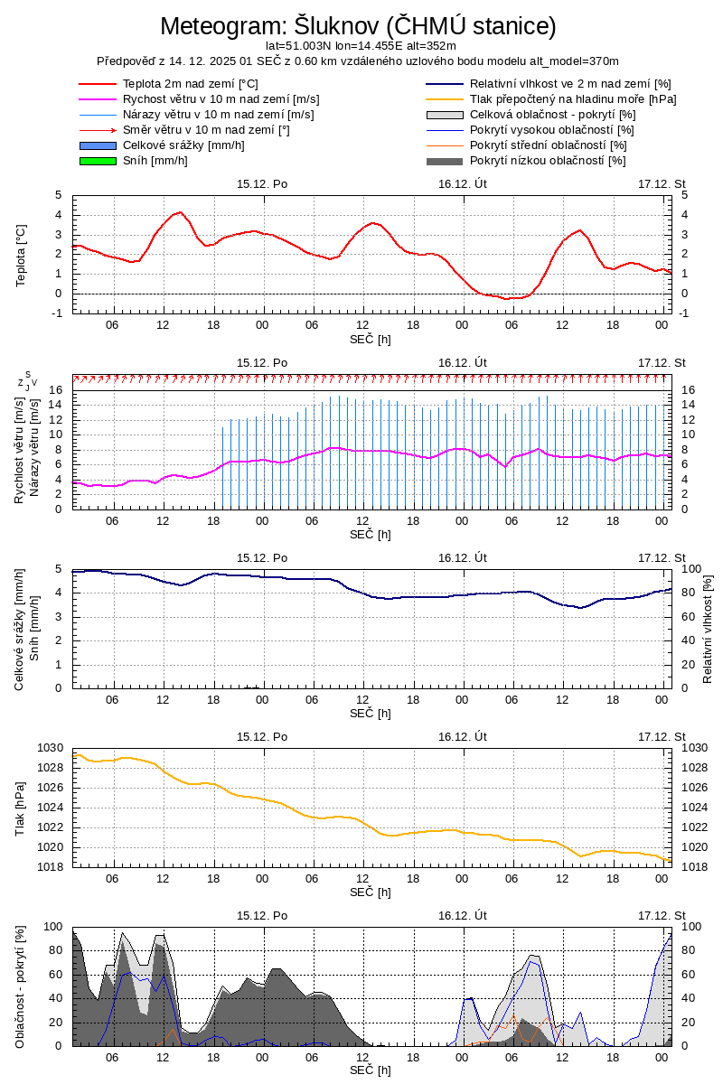 | Legenda: | Oblačnost (%) | Srážky dešťové(mm/m2 za hod.) | Vítr (m/s) |