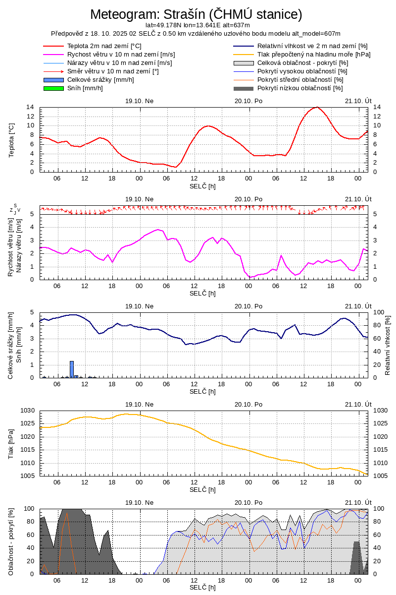 Legenda: | Oblačnost (%) | Srážky dešťové(mm/m2 za hod.) | Vítr (m/s) |