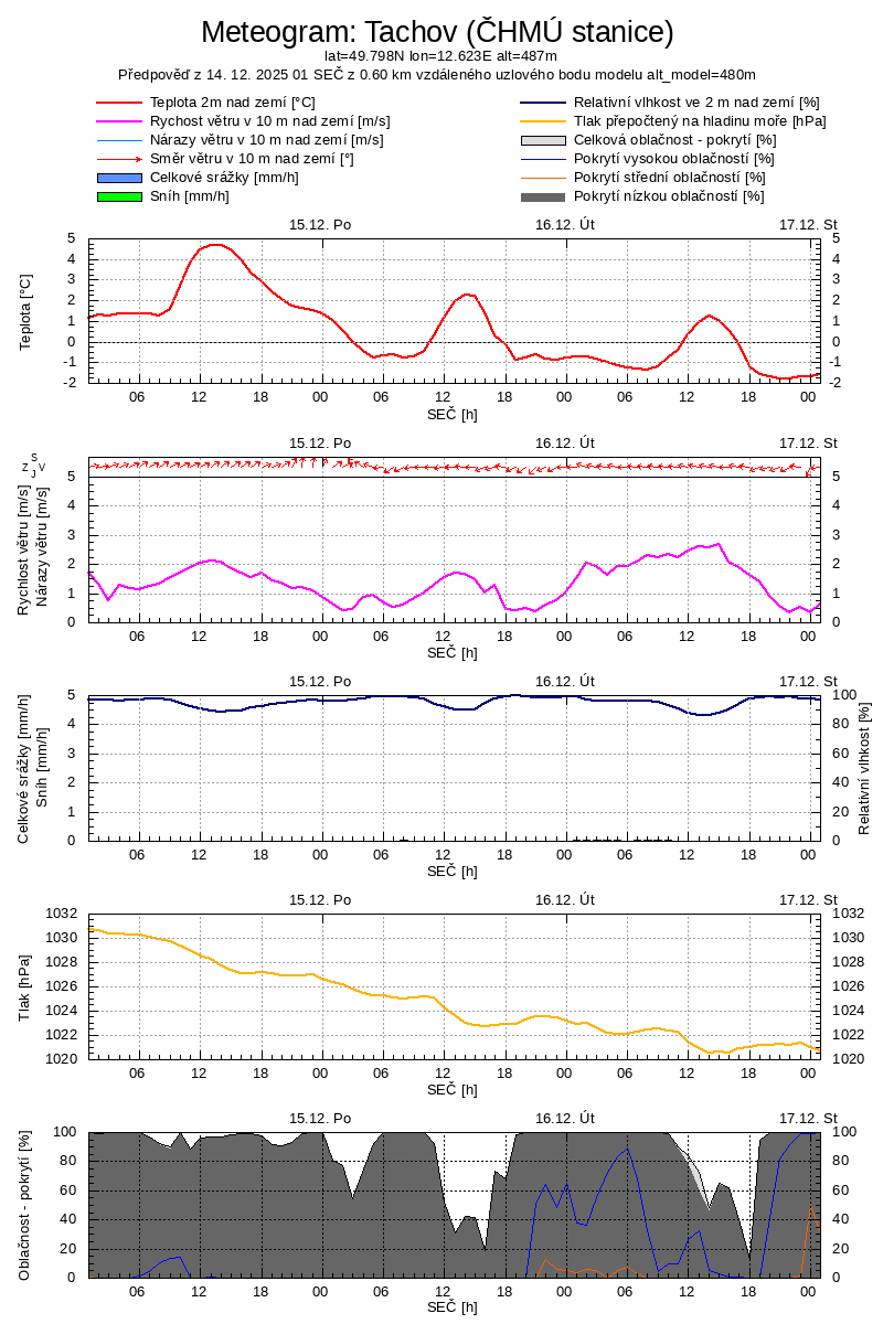 | Legenda: | Oblačnost (%) | Srážky dešťové(mm/m2 za hod.) | Vítr (m/s) |